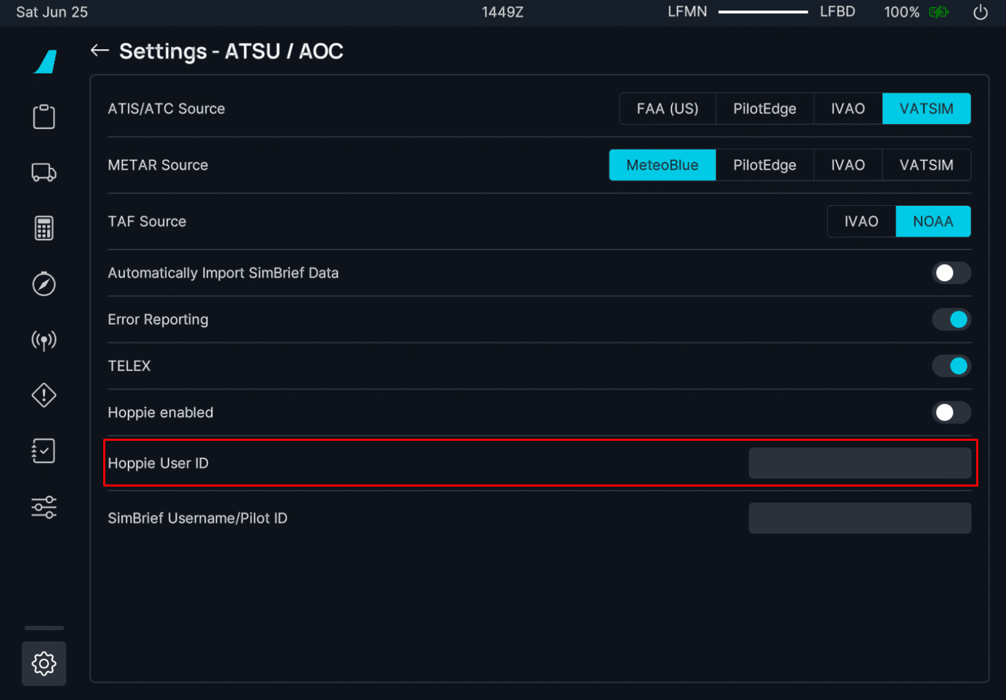 It is required to configure the A32NX to use the Hoppie system. All configuration entries are set in the Settings-pages of the EFB.