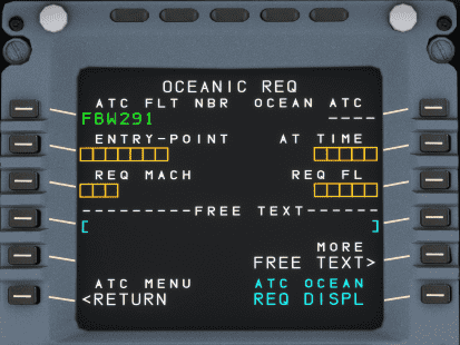 The OCEANIC REQ page requires you to be on the last station before an oceanic route. You need to enter your planned entry point, time at entry point, speed, and flight level.