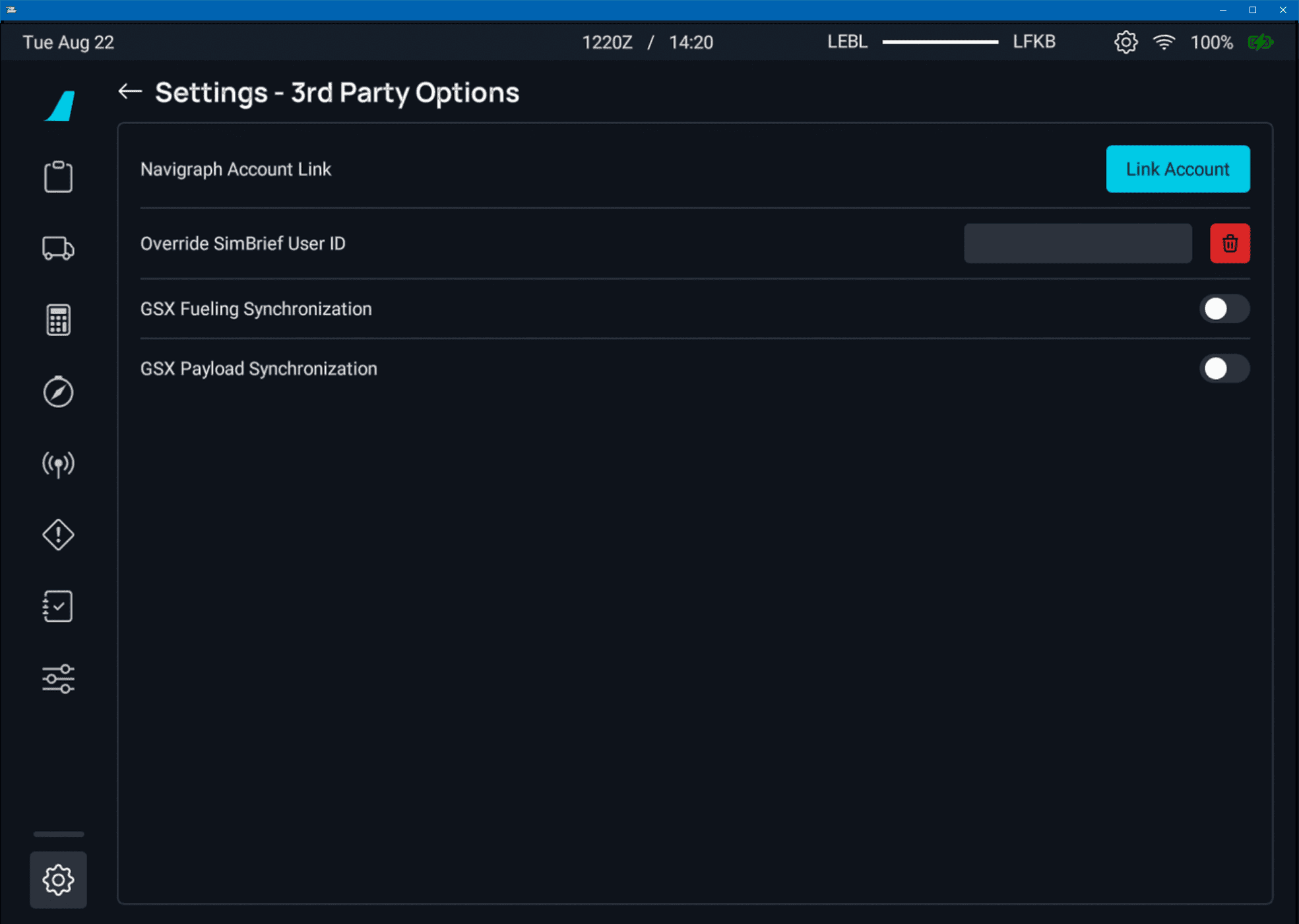 Please use the Quick Links to jump to any relevant section. For connecting your SimBrief/Navigraph Accounts, click the button below.