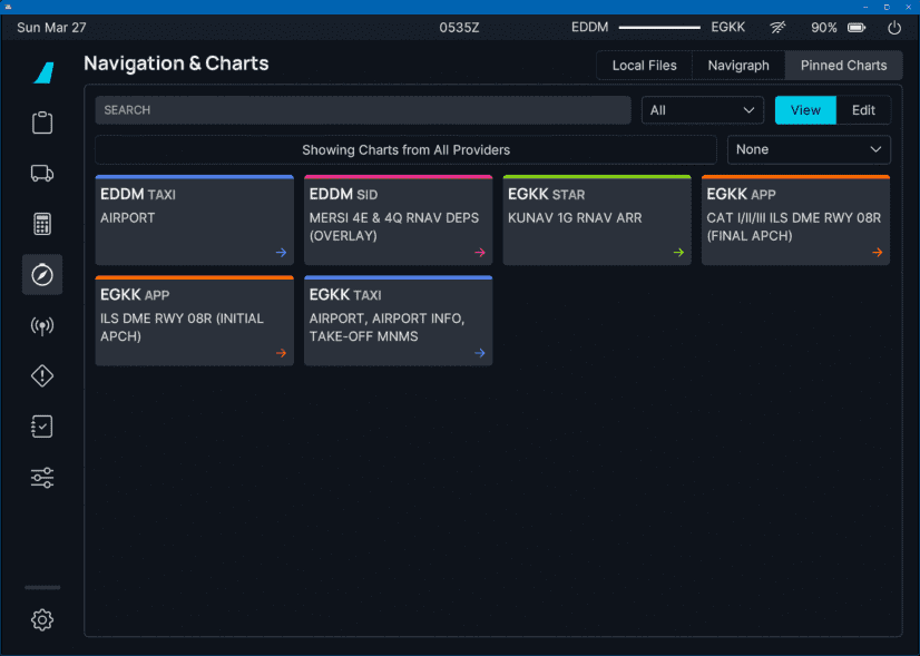 After authenticating, you will have access to the Navigraph page where you can list available charts for airports, view and pin them, etc. See the list of controls below.