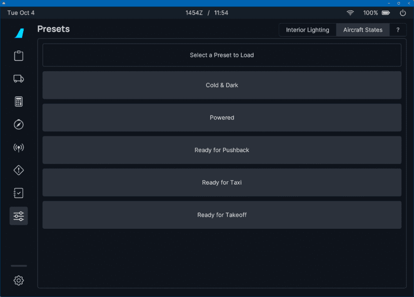 Aircraft presets allow you to automatically let a virtual co-pilot set up your aircraft to the requested preset state.
