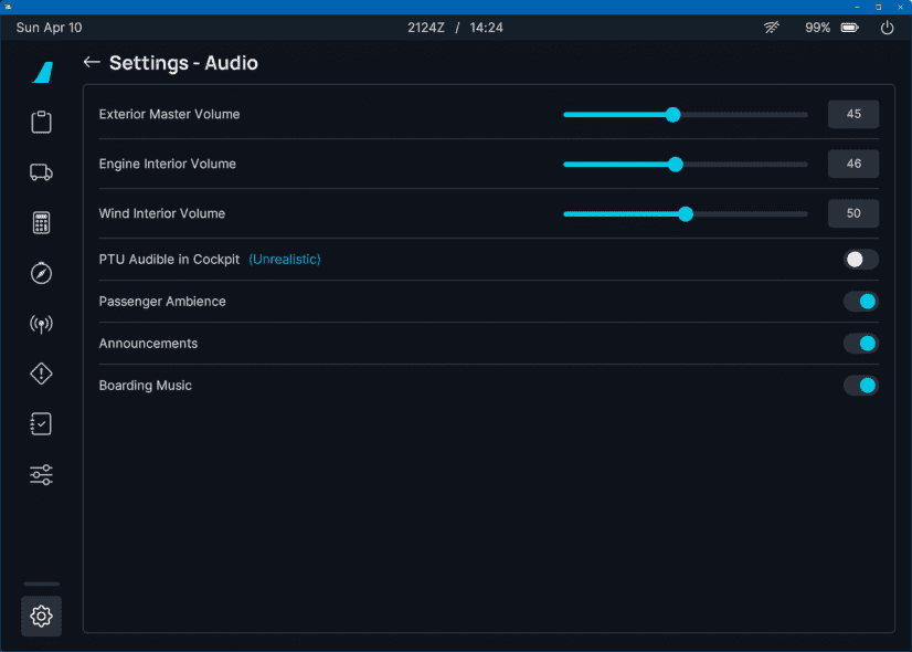 • Dynamically adjust various audio elements while in the virtual cockpit.
