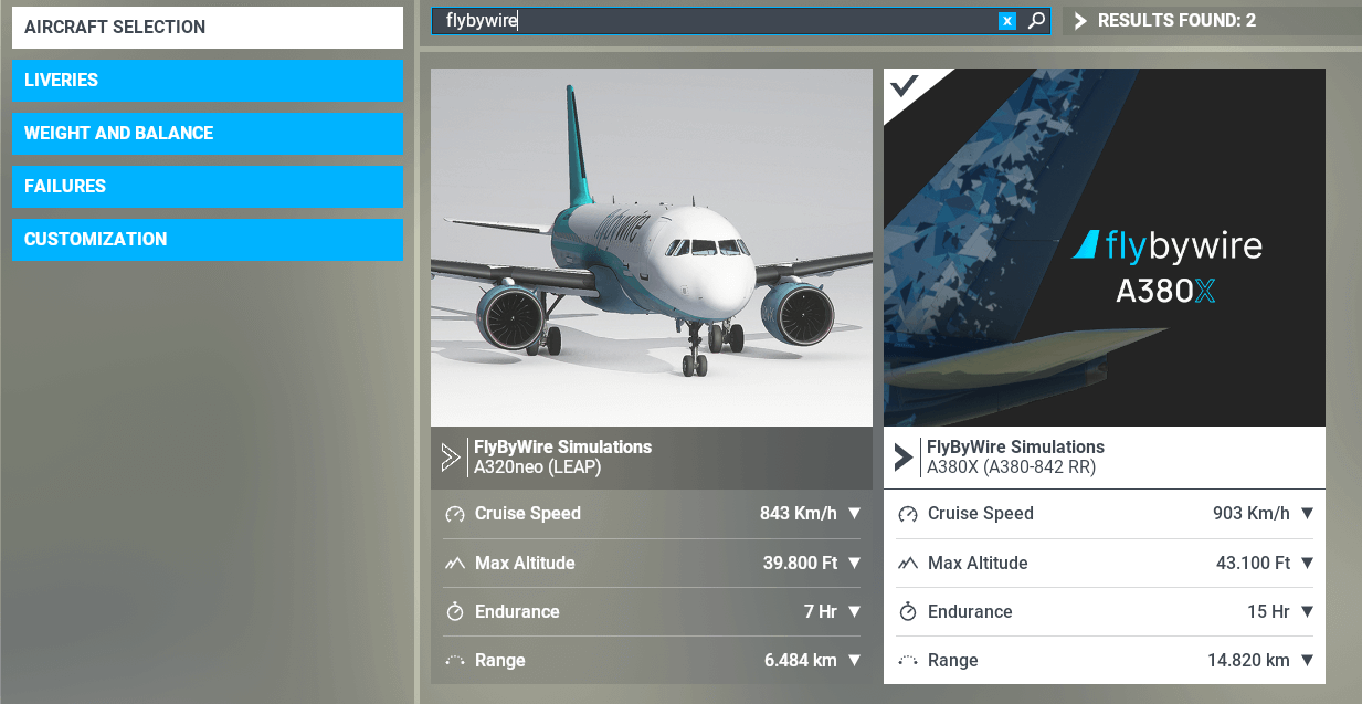 • The A32NX is listed as FlyByWire Simulations A320neo (LEAP)
