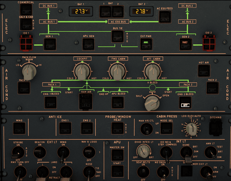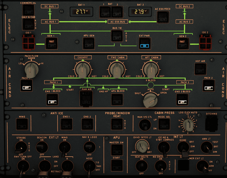 With this air supply, an engine is started on stand before pushback while external power is still available to it. After the start, the ASU and external power is removed to allow for pushback and then a crossbleed start for the other engine.