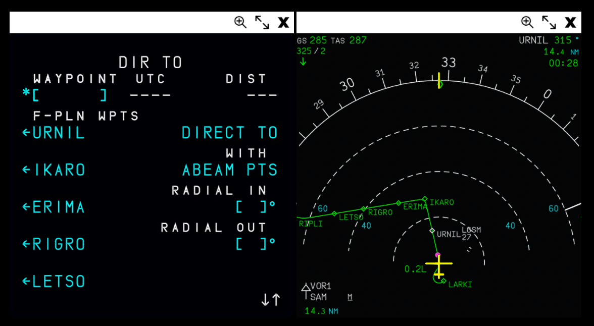 This is useful when pilots would want to check fuel, time, or other actions after inserting the direct to waypoint. The abeam waypoints would be prefaced with AB on both the Navigation Display and the F-PLN page.