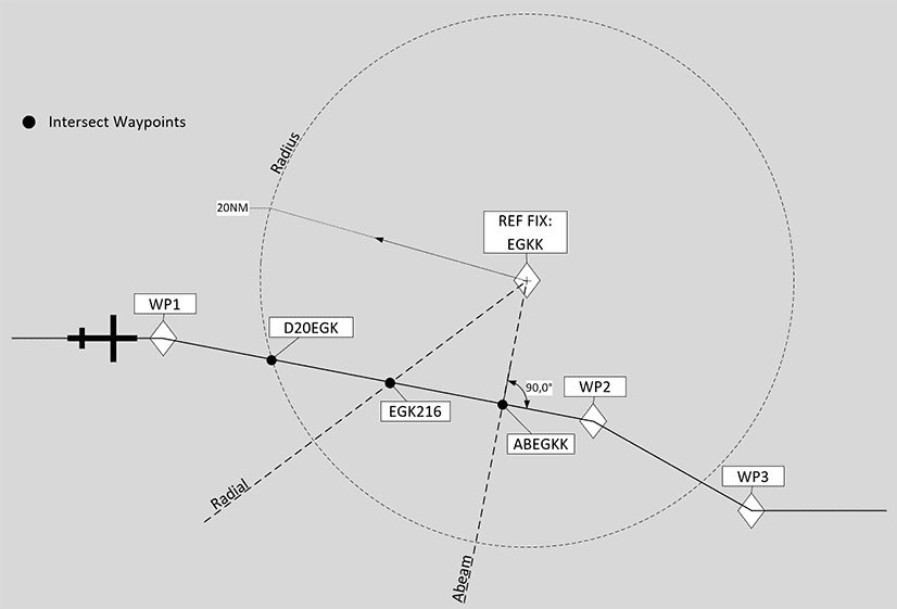 A reference fix (REF FIX) named EGKK is used to show the three different methods of creating intercept waypoints.