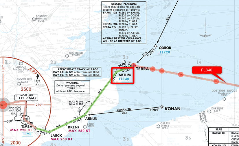 FL340 with arrival TEBRA2G into Gatwick EGKK.