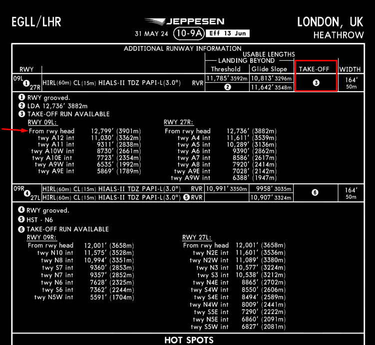 For a large airport like EGLL, there is not enough space to add the additional runway information on the 10-9 chart. In this case, TORA distance for each runway and for intersection takeoffs is provided on the 10-9A chart. For a Runway 09L full-length takeoff, the TORA is 12,799 feet, or 3901 meters.