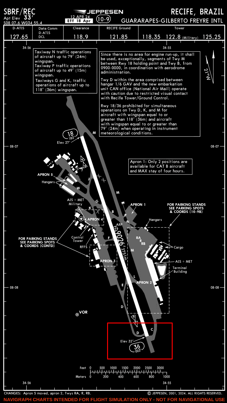 Be aware that some runways for which the airport 10-9 chart shows a zero-degree runway entry angle, MSFS 2020 has the taxiway aligned such that a 90-degree entry angle is required. One example of this is SBRF/Recife, Brazil. The marked area in the airport 10-9 chart below shows that the airplane can be aligned in the direction of takeoff before entering the black runway area. In MSFS 2020, however, the taxiway meets the runway end at a 90-degree angle.