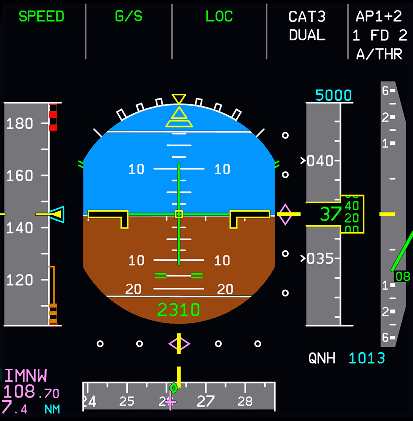 This has priority over speed, and the aircraft might slow down or accelerate if Autothrust cannot compensate for the requested flight path angle. If the aircraft's speed reaches VLS or VMAX the requested flight path angle cannot be maintained any longer and this annunciator is boxed in amber and flashes. The flight path angle target pulses.