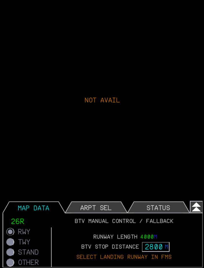 Change to the "MAP DATA" tab, check that the selected landing runway is correct and enter the desired stopping distance in the input field next to "BTV STOP DISTANCE" (don't forget to finish by pressing the enter key).