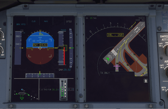 If the aircraft is on the ground and ground speed is below 40 knots, OANS continuously checks the aircraft protection area in front of the aircraft (as wide as the wingspan, projected 7 seconds ahead) for runways. When detecting a runway inside this area, an advisory is triggered on the PFD and ND. The advisory disappears when the above conditions aren't met anymore, or the aircraft has entered the runway.