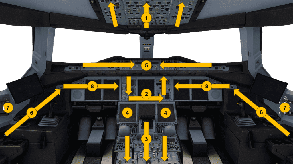 The cockpit preparation flow is an easy way to remember the steps to startup and setup the aircraft correctly. It follows a flow starting on the overhead panel on the left buttom moving up and then to the right. Then it continues the flow on the main panel starting and moving to the pedestal, setting up the FMS to then continue to the glareshield. At last the lateral consoles are checked and set up.