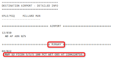 It provides runway condition codes (the numbers X/X/X) for each third of the specified runway, as well as a text description of the surface condition and the time of the report.